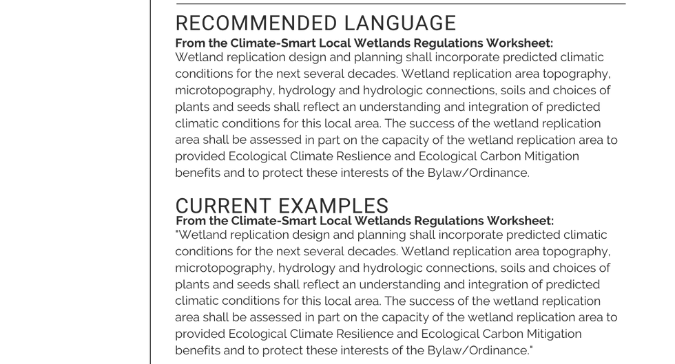 Wetlands are invaluable in providing carbon storage, sequestration and resilience to the impacts of climate change including providing localized cooling, while simultaneously being extremely sensitive to these impacts themselves. Wetlands are particularly biodiverse, and biodiversity tends to confer climate resilience. Protecting wetlands from climate impacts is essential to protecting the other WPA and bylaw/ordinance interests. The existing eight interests of the WPA all provide climate adaptation and resilience benefits to humans and nature.